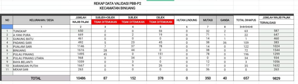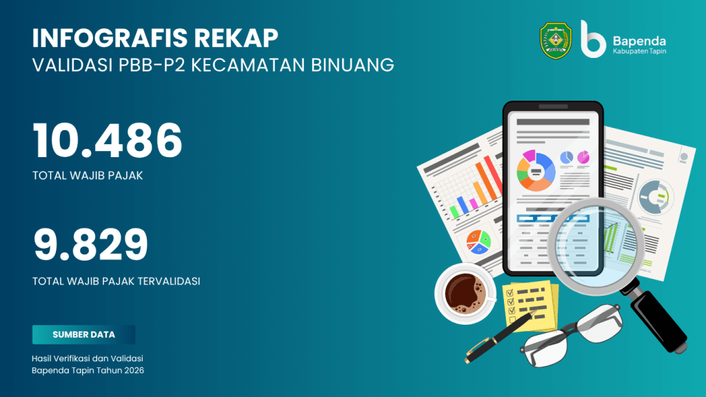 Tapin — Badan Pendapatan Daerah (Bapenda) Kabupaten Tapin berhasil menyelesaikan kegiatan Verifikasi dan Validasi Pajak Bumi dan Bangunan Perdesaan dan Perkotaan (PBB-P2) di wilayah Kecamatan Binuang pada Tahun 2026. Dari total 10.486 Wajib Pajak yang terdaftar, sebanyak 9.829 Wajib Pajak dinyatakan tervalidasi.